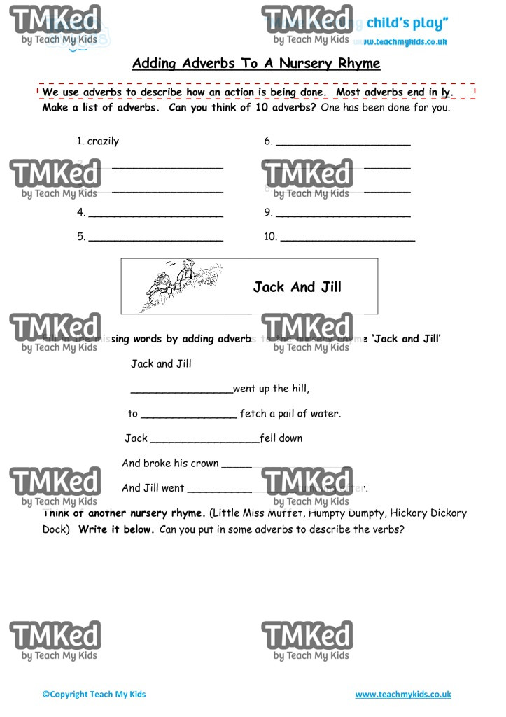 Fill in the missing words by adding adverbs to the nursery rhyme ‘Jack and Jill’.