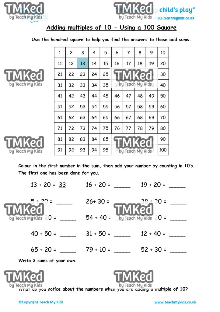 - Adding Multiples of 10 – Using a 100 Square