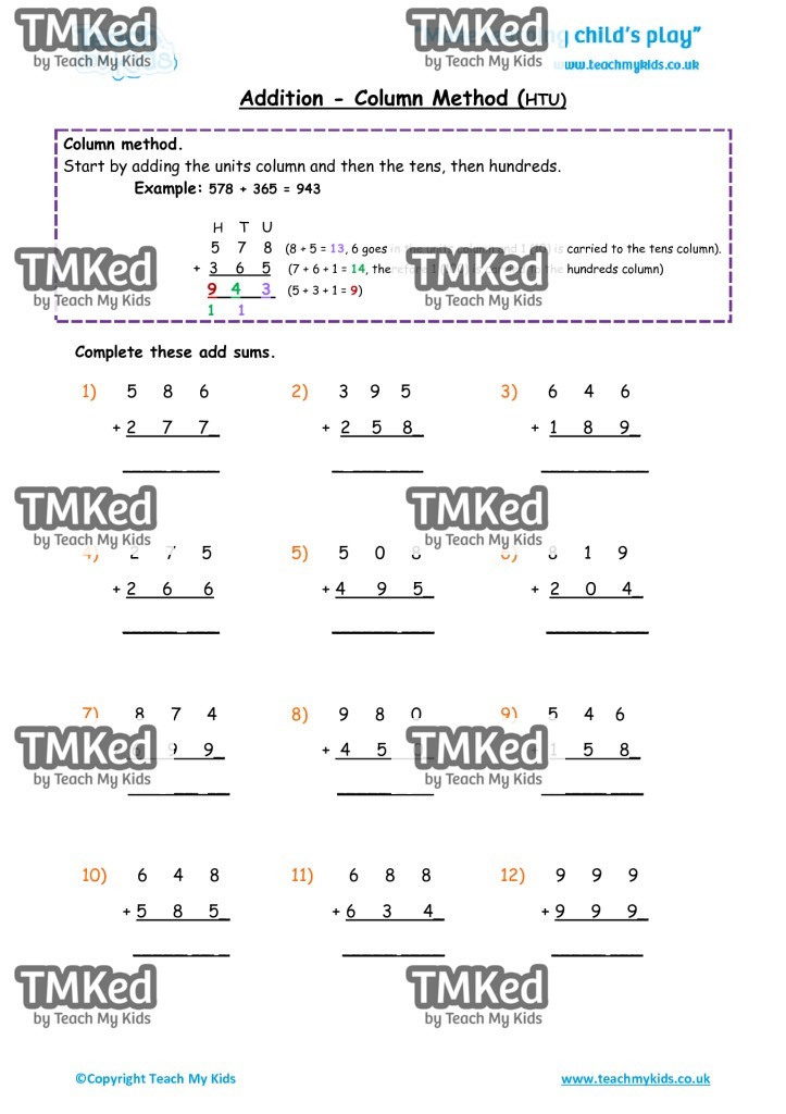 Column method. Start by adding the units column and then the tens, then hundreds. Complete these add sums.