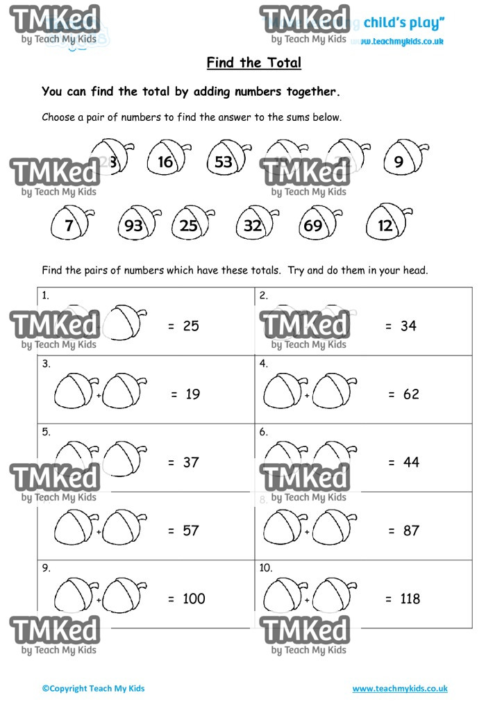 You can find the total by adding numbers together. Choose a pair of numbers to find the answer to the sums.