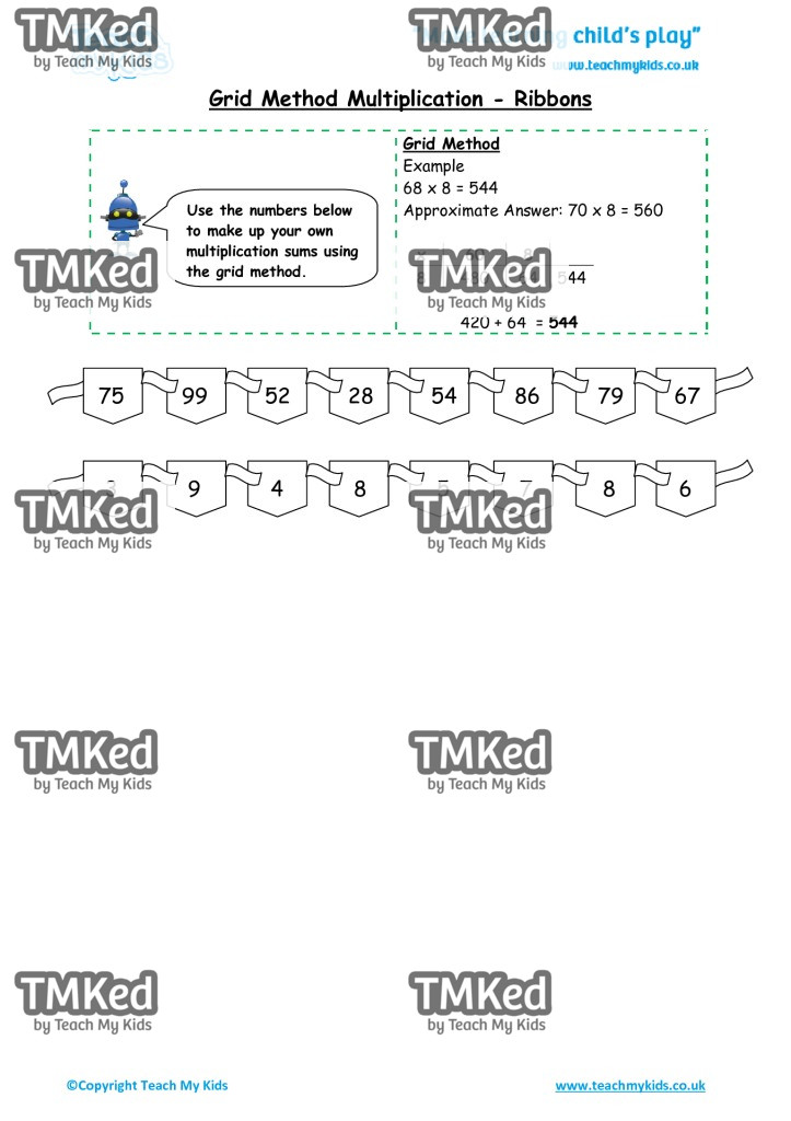 Use the numbers below to make up your own multiplication sums using the grid method.