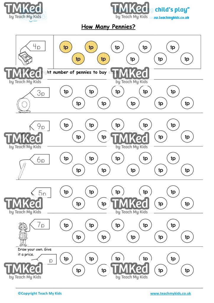 Colour the right number of pennies to buy each item.