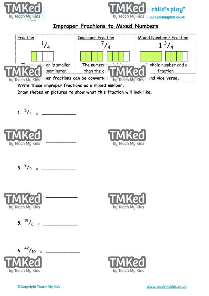 Write these improper fractions as a mixed number. Draw shapes or pictures to show what this fraction will look like.