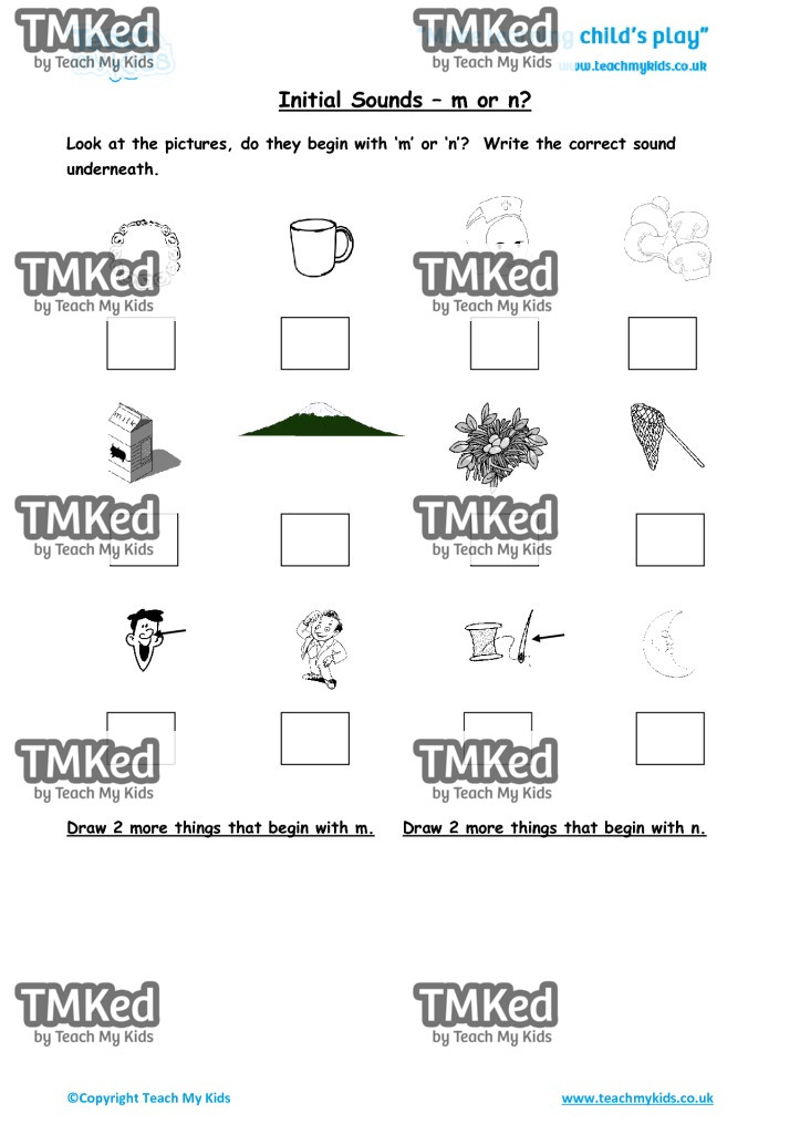 Look at the pictures, do they begin with ‘m’ or ‘n’? Write the correct sound underneath.