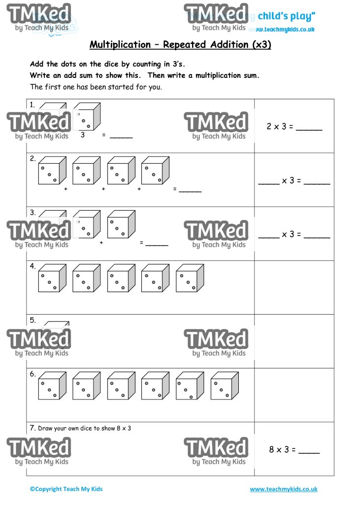 Add the dots on the dice by counting in 3’s. write an add sum to show this.