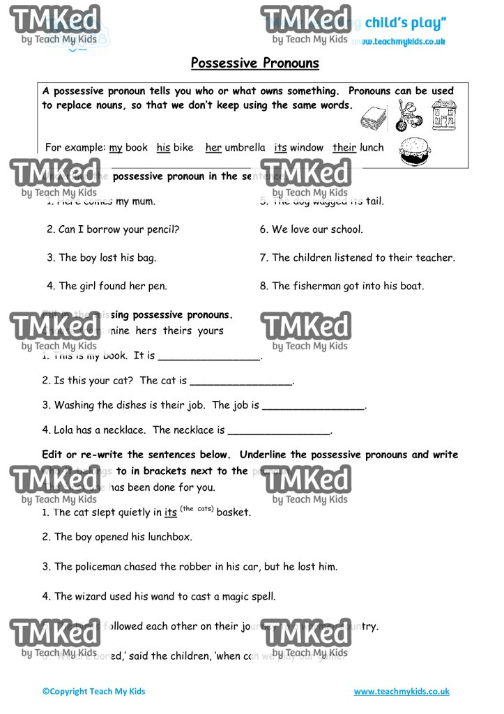 A possessive pronoun tells you who or what owns something. Pronouns can be used to replace pronouns, so that we don’t keep using the same words.