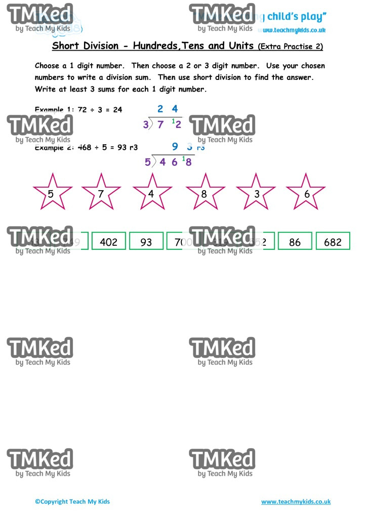 Choose a 1 digit number. Then choose a 2 or 3 digit number. Use your chosen numbers to write a division sum. Then use short division to find the answer. Write at least 3 sums for each 1 digit number.