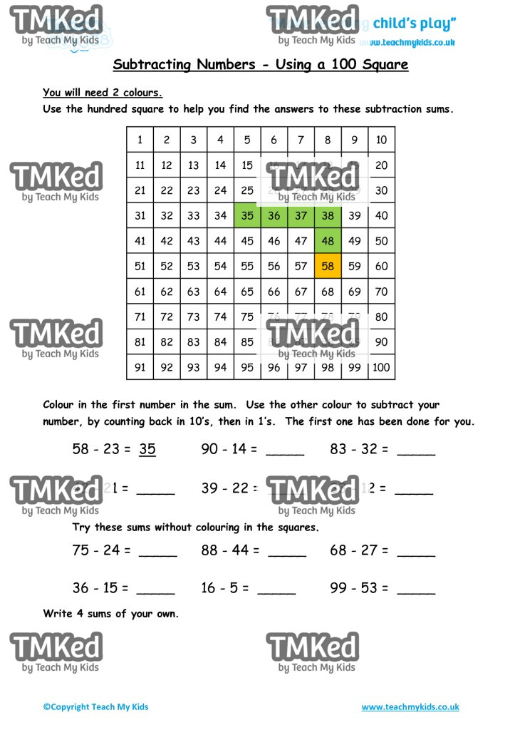 Subtracting Numbers – Using a Hundred Square