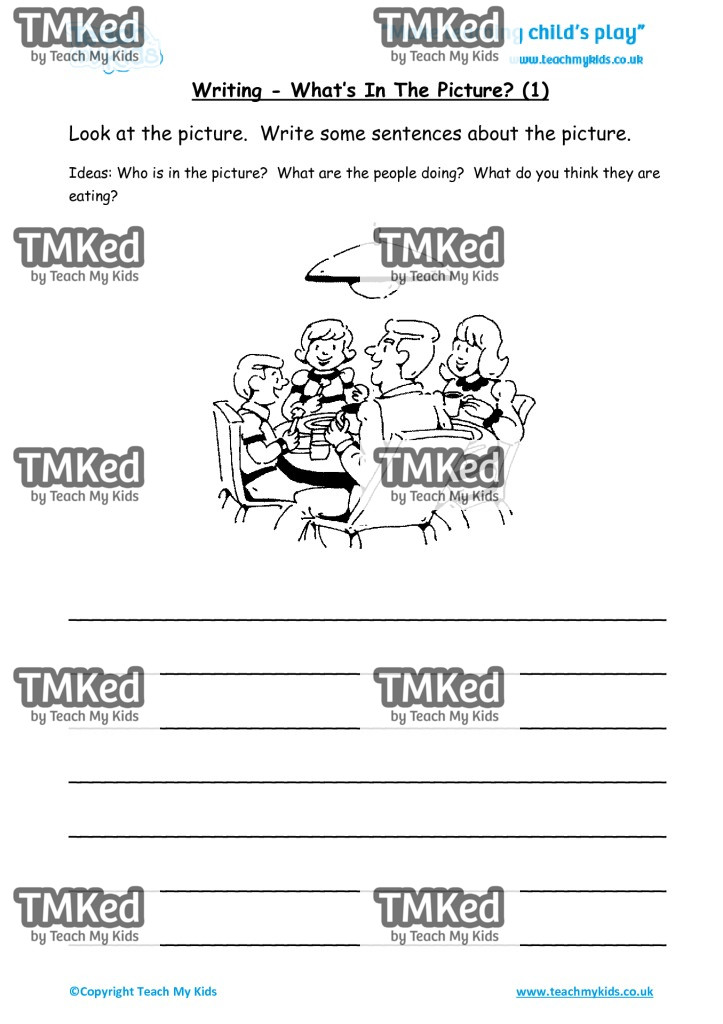 Look at the picture. Write some sentences about the picture. Ideas: Who is in the picture? What are the people doing? What do you think they are eating?